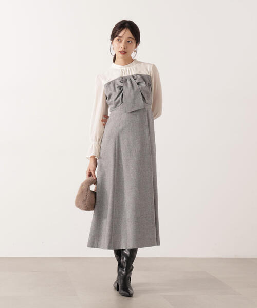 <petit size>通常のSサイズやMサイズから着丈などの長さを短くリサイズし、152cm Aroundの小柄さんにもバランスよく着用いただけるサイズに仕上げています。ZOZO・official site・店舗のみの限定展開です。PS(商品によってはPM/PXSの展開あり)でのサイズ表記になっています。デイリーからお呼ばれシーンまで合うドッキングワンピース。少し透けるシフォンブラウスをレイヤードしたようなデザインで、柔らかい印象に見せてくれます。襟のタックギャザー、胸元リボン、手首が締まったフレアスリーブなど、細かいディテールが効いたデザイン。さり気ないラメ糸混のミックスツイードが華やかな雰囲気を叶えます。<素材>シフォンとツイード素材を使用しています。<詳細>仕様・後ろファスナー裏地・あり透け感・ややあり / 光沢・なし / 伸縮性・なし生地の厚さ・普通※モデルの着用画像の場合、光の当たり具合により、実際の色味と異なって見えることがございます。色味は、商品単体の画像をご参照ください。<商品のお気に入り登録>お気に入りアイテムの値下げ・再入荷・在庫1点などの通知を受け取ることができる便利機能ですので気に入ったアイテムはお気に入り登録がおすすめ!<ショップのお気に入り登録>新商品や再入荷、セール、クーポン配布などお得な情報を受け取ることができます。●撮影はサンプル商品で行っている為、仕様とサイズが異なる場合がございます。●スタジオ及び屋外で撮影した着用画像は、光の当たり具合で色味が違って見える場合があります。予めご了承ください。