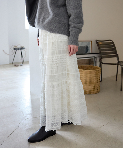 裏地あり/ドロストコード付き/ウエストゴム 【2025AW】 SLOBE IENA 大好評につき追加生産が決定しました! ※旧品番25060912826040の追加商品です。 ※若干の仕様変更がある場合もございます。 POINT ・生地自体にシャーリングでプリーツが入った、 無地とドットドビーの2種類の素材をあわせてお作りしたスカート。 【素材の特徴】 軽やかな生地感ですが、裏地付きで安心感があります。 合わせるトップスの幅も広く、シーズンレスに着回しのきくアイテムです。 【デザイン】 華やかな動きが出るティアードのシルエット。 総ゴムでイージーな履き心地。 ドロストコード付きでご自身のウエストに調整いただけます。 【コーディネート】 ニットやアウターの時期でも着やすいシアーな素材感のスカート。 重たいアイテムも軽やかで華やかに見せてくれます。 ※こちらの商品は、WEB限定商品です。 店舗へは入荷致しませんのでお問い合わせの際にはご注意ください。 ********************** 透け感:なし 裏地:あり 伸縮性:ややあり 光沢感:なし 生地の厚さ:普通 ********************** 【スタッフ着用コメント】 《スタッフ名:natsu》 年齢:30代後半/身長:160cm/体型:標準/普段サイズ:M~L/着用サイズ:フリー サイズ感:マキシ丈で着れる長さ。ウエストゴムで紐も通っているので調整しやすいです。 素材感:さらっとしていて厚手過ぎない印象です。全体的に表面感があります。 着心地:裏地もしっかりしているので透けも気にせず着用できました。 ********************** ※取り扱いについては、商品についている品質表示でご確認ください。 こちらの商品は、SLOBE IENAでの取り扱いになります。 直接店舗へお問い合わせの際はSLOBE IENA店舗へお願い致します。 ※照明の関係により、実際よりも色味が違って見える場合があります。 またパソコン・スマートフォンなどの環境により、若干製品と画像のカラーが異なる場合もございます。 予めご了承ください。 ※商品の色味は、商品アップ画像をご参照ください。 ブラック着用スタッフ身長:162cm 着用サイズ:フリー ホワイト(メイン)着用スタッフ身長:165cm 着用サイズ:フリー ホワイト着用スタッフ身長:159cm 着用サイズ:フリー 詳細着用スタッフ身長:163cm 着用サイズ:フリー 本体:手洗い可能