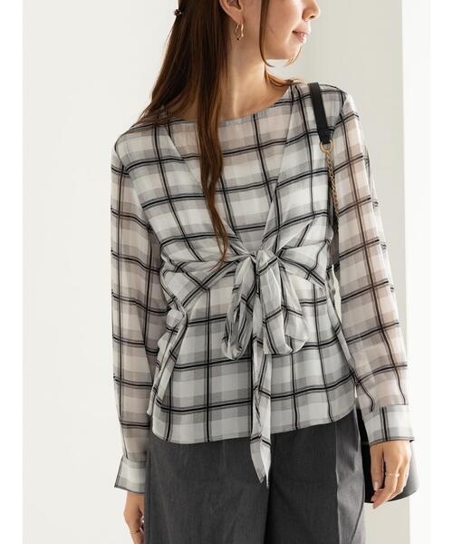 トレンド感たっぷりのシアーチェック素材を使用したフェミニンなリボンブラウス。程よい透け感と繊細なチェック柄が女性らしさを引き立て、軽やかな印象を演出します。デザインポイントのリボンはフロントで結んで着用して頂くのはもちろん、クロスして後でリボン結びしても着用して頂けます。インナーを合わせてレイヤードも楽しめ、パンツにもスカートにも合わせやすい万能アイテム。オンにもオフにも活躍します。※商品画像は、撮影環境やお客様のご利用のPC・スマートフォンのモニター環境などにより実物と色味に差異がある場合がございます。