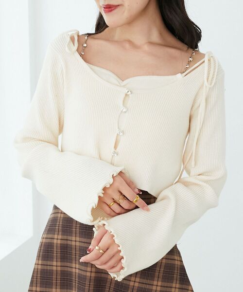 ビジューで魅せる、着回し自在な華やぎセットアイテム ■デザイン ビジューボタンが目を惹くカーディガンと、ビジューチェーンの肩紐がアクセントのキャミソールがセットになった、フェミニンムードたっぷりのアイテム。 カーディガンはややコンパクトな丈感で、スタイルアップ効果も◎ デコルテや肩まわりを美しく見せてくれるデザインで、トレンドの抜け感を演出。 セットで着るとキラっと華やかなコーデが完成し、それぞれ単品でも使える着回し力の高さも魅力です。 スカートと合わせて甘めに、デニムと合わせてカジュアルにと、幅広いスタイルが楽しめます。 ■サイズ感 程よくフィットするサイズ感。伸縮性があるので着心地抜群です。 キャミソールのビジューチェーンは取り外しが可能です。 ※カーディガンのネックポイントからの着丈:40cm ■スタイリング デニムでカジュアルダウンしたり、フレアスカートでフェミニンに仕上げたりと、シーンに合わせてセットでも単品でも使える万能アイテムです。 ・・・・・・・・・・・・・・・・・・・・・・ 透け感:なし 裏地:なし 伸縮性:あり 光沢感:なし 生地の厚さ:普通 ・・・・・・・・・・・・・・・・・・・・・・ ■商品のお気に入り登録:再入荷通知やのこりわずか、お得なプライスダウンの情報も受け取ることができます。 ぜひご登録ください◎ ※サンプルでの撮影の為、製品と仕様が異なる場合がございます。 ※商品の色味は、撮影場所や光のあたり具合などにより色味が違って見える場合がございます。 また、お客様のお使いのモニター環境などにより色味が異なって見える場合がございます。 予めご了承の上ご注文下さい。