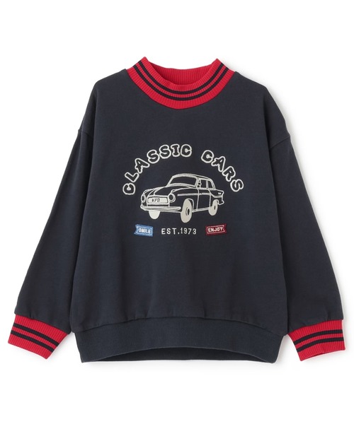 衿と袖口に配色のラインリブを使用したトレーナーです。胸には、クラシックカーのモチーフを線描きの刺しゅうで表現、カジュアルな雰囲気をプラス。裏は起毛させてあるので温かで、これからの季節、デイリーに活躍してくれそう。