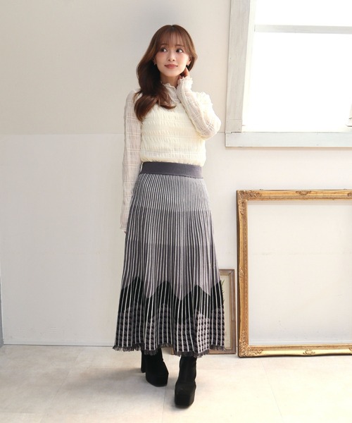 プリーツジャガードのニットスカート。秋冬のトレンド柄をニットで表現したアイテムです。分量感のあるプリーツもニットの重みで真下に落ち広がりすぎない上品なシルエットが出るのが特徴。腰周りはすっきりとしたデザインなので、トップスを出して着こなしても着ぶくれせずに着こなせます。