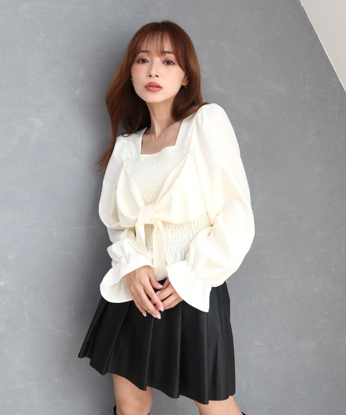1枚でコーディネートの主役になる、ガーリーでフェミニンな雰囲気のブラウス。胸元の大きなリボンが女性らしさをより引き立ててくれます。見頃はシャーリングゴム仕様で、ストレスフリーな着心地。ボディラインがすっきり見えるので、スタイルアップ効果もあります。スクエアネックが首元をすっきり見せてくれ、少し大人っぽく、キレイ目な雰囲気にしてくれます。ボリューム感のある袖は華奢見え効果もあり、より女性らしい印象に◎ショート丈なのでハイウエストのボトムスと相性が良いです。タイトのロングスカートやスラックスパンツなどと合わせればキレイ目な印象になるので、オフィスカジュアルコーデにもおすすめです。ショート丈のボトムスと合わせればトレンド感のある韓国ファッション風コーデに。