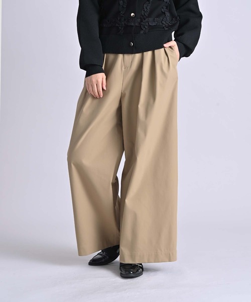 機能とモードを両立する、ユーティリティワイドパンツ 【デザイン&ディテールポイント】 しなやかなストレッチ性で動きにフィットし、シワになりにくいイージーケア性を備えたユーティリティ素材を使用した3タックのワイドパンツ。 やや薄手でシャープな綾目が映えるマットなルックスと、さらっとした風合いが心地よい生地は、リサイクルポリエステルを一部使用したエコ素材。 撥水機能付きで天候の変化にも対応でき、デイリーに頼れる一本。ウエストはゴム仕様でストレスフリーな履き心地。 前ウエストの釦明きがきれい目とカジュアルの中間のバランスをつくり、幅広いスタイリングにマッチ。 【スタイリングポイント】 ジレを重ねて縦のラインを強調し、機能素材をモードに仕上げるレイヤードスタイルがおすすめ。 ■使用上の注意 極度の摩擦はおさけ下さい。 軽く押し洗いをして下さい。 あて布使用。 =========================== 厚み:普通 伸縮性:あり 裏地:なし 透け感:なし 生地感:普通 洗濯:手洗い可 =========================== 【RAWFUDGE/ローファッジ】 30代の女性が着たいリアル服を作りたいそんな思いから女性が中心となり立ち上げたブランドです。 【Mode】【Standard】【Luxe】をキーワードに大人女性に向けシンプルの中に遊び心のあるシャツ・ブラウスを中心に心地良さとオシャレを両立させる、ありそうでない進化系リアルクローズを提案します。