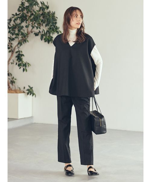 【完成度の高い重ね着がこれだけでできる、うれしい3点セット。こだわりのディテールで、ちょっとしたオケージョンにも対応】【Design/Styling】プルオーバー型のベストと、美脚ラインの叶うタックテーパードパンツ、さらにインに重ねられるニットタートルを合わせた、3点がセットに。ベストは上品な ネック開きと、モード感のある美しいフレアが特長。動くとさらに印象的なフォルムを表現してくれます。また、ゆったりとしているので身体のラインもカバーできます。パンツはセンタープレス入りの立体的なストレートシルエット。すっきり脚長をサポート。トップスとのバランスもよく、タック入りで着やすい一枚です。インナータートルは、シルク混の糸で編み立てた、シアー感がポイント。しなやかで肌ざわりもよく、スタイリングを上品に引き締めてくれます。セットで着るのはもちろん、それぞれが単品でも映える、着回し力も高まります。学校行事など、オケージョンのシーンにもおすすめです。【Fabric】プルオーバー型ベストとパンツは、上品な光沢と落ち感のある、印象的な質感です。インナータートルは、シルクと羊毛が入った、軽くて肌ざわりのよい糸を編み立てています。カラーは3色をご用意。秋らしく優しい印象の<BEG>、モノトーンでまとめたシックな<BLK>、ツイード調のトップスに黒ボトムの<MIX>で展開しています。※照明の関係により、実際よりも色味が違って見える場合があります。またパソコン・スマートフォンなどの環境により、若干製品と画像のカラーが異なる場合もございます。予めご了承ください。商品の色味は、商品単品画像をご参照下さい。 ※商品画像はサンプルのため、色味やサイズ等の仕様に変更がある場合がございますので、予めご了承ください。