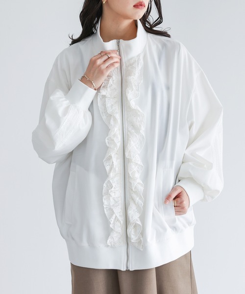 ■デザイン前立てにレースフリルを挟み込んだデザインのブルゾン。袖にもレーステープを付けた大人可愛いデザインです。カジュアルなブルゾンにレースとフリル使いで周りと差のつく1着に。■コーディネートカジュアルにもフェミニンにも着こなせるレースデザインのブルゾンです。ワイドデニムやストレートデニムと合わせれば甘さを抑えたこなれたスタイリングが完成。ファスナーの開け閉めで抜け感を調節でき、幅広いスタイルにプラスしていただけます。■素材身生地には肌触りの良いシャツ生地、レース生地は風合いのある柔らかな花柄レース生地を使用。シャツ生地なので季節の変わり目など、ロングシーズンでご着用いただけます。■製品についての注意書き染色の特質上、発汗や摩擦により色落ちすることがありますのでご注意ください。また、着用中の摩擦により色移りしやすい特性がありますので、白や淡色との組合わせはご遠慮ください。他の製品に色が移ることがありますので、一緒に洗わず単独で洗ってください。ご了承の上、ご購入いただきますようお願いいたします。
