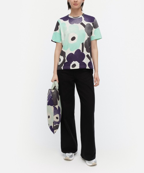 【ASIA EXCLUSIVE】アジア限定『Marimekko Kioski』 マリメッコのアイコン的プリントを再解釈し、無限のワードローブを提案するジェンダーニュートラルなストリートウェア Marimekko Kioski(マリメッコ キオスキ)。「他人の真似はせず、自分らしく」をキーワードに、作り物ではないオーセンティックなスタイルを追求したコレクション。【テキスタイルデザイン:Maija Isola(マイヤ・イソラ)】 Unikko(ウニッコ):花美しい色合いのUnikko柄が着こなしを引き立てるTシャツ。ほど良いフィット感のあるシルエットで、スマートなコーディネートに。素肌にやさしいコットン素材も、着心地良さのポイントです。※品質表示は、Marimekko社の付けた洗濯表示を日本国内の基準に合わせ付け替えております。本国のタグはカットされておりますので、予めご了承ください。※断裁により商品ひとつずつの柄の出かたが異なるため、表示画像のディテールと多少異なるデザインのものが届く場合がございます。予めご了承ください。モデル着用サイズ:M/038/004
