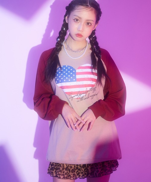 鮮やかなハートで魅せるカジュアルスウェット●印象的な星条旗ハートが目を引く存在感たっぷりのデザイン。●ラグラン切り替えの配色が、シンプルながらもメリハリあるスタイルを演出。●ゆったりとしたシルエットで動きやすく、デイリー使いにぴったりの1枚。♦detail柔らかな生地感と程よい厚みで季節を問わず活躍するスウェットです。胸元の大きなハートプリントがコーディネートのアクセントになり、着るだけで元気でポップな印象に。ラグランスリーブならではのスポーティさがプラスされ、パンツにもスカートにも合わせやすいデザインです。長めの丈感は1枚でラフに着ても重ね着してもバランスよく決まります。♦styling〇ストリート系 → 迷彩柄ショーツやキャップを合わせてボーイッシュに〇ガーリー系 → プリーツスカートやリボン小物で可愛らしく〇スポカジ系 → レギンスやスニーカーと合わせてアクティブに♦コーデにオススメサイハイデザイン パンツ【キッズお揃い】(912-7794)クラッシュ デニム プリーツ スカート【キッズお揃い】(911-7647)-----------伸縮性・・・あり透け感・・・ブラックのみ若干あり光沢感・・・なし生地の厚さ・・・普通ポケット・・・なし裏地・・・なし-----------<サイズ>XS(135cm~145cm)S(145cm~155cm)M(155cm~165cm)※商品のお取扱いに関しましては、商品に付属のアテンションカード、洗濯ネームをご覧ください。※モデル着用画像は光の当たり具合で色味が違って見える場合がございます。※商品の色味の目安は、商品単体の画像をご参照ください。【お買いものをお楽しみいただく為に!】▼商品のお気に入り登録完売カラーの再入荷通知や、ラスト1点の通知、セールの通知も受け取ることができます。▼ブランドのお気に入り登録新商品や再入荷など、いち早くブランドのお得な情報を受け取ることができます。