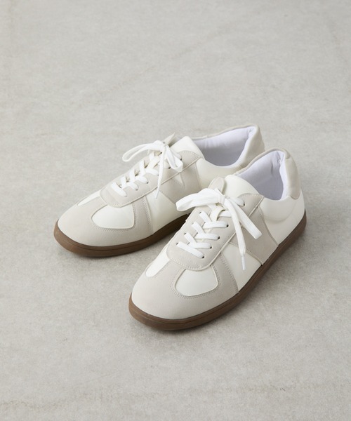 【クラシックなシンプルデザインと快適な履き心地】ドイツ軍のトレーニングシューズとして誕生した伝統的な「ジャーマントレーナー」が現代のファッションにフィットするスタイルで登場。アッパーにはフェイクスエード×スムースレザーのコンビ素材を使用し上品さとヴィンテージ感を演出。クラシックなフォルムとシンプルなデザインはどんなコーディネートにも馴染みやすく長く愛用できる一足です。スニーカーでありながらきれいめスタイルにも合わせやすい洗練された佇まいが魅力です。カジュアルからスマートカジュアルまで幅広く対応し、季節を問わず使いやすい定番アイテムとしておすすめします。【商品ポイント】・ドイツ軍由来のクラシックなデザイン・シンプルで合わせやすいミニマルなフォルム・カジュアルからきれいめまで幅広いコーデに対応【素材についてのご注意】こちらの商品は、スエード風のやわらかい風合いをいかした素材を使用しています。素材の特性上、摩擦や汗・雨などで濡れた状態では、まれに色落ち・色移りが起こる場合がございます。特に、白や淡いカラーのお洋服・バッグと合わせる際は、ご使用の環境にご注意いただけますと安心です。気になる場合は、ご着用前に目立たない部分で軽くこすっていただき、色移りがないかご確認ください。----------------------------------------------------■素材甲材: 合成皮革底材: 合成底----------------------------------------------------※着用、お取り扱いの際は、商品についている品質表示とアテンションタグを必ずご確認下さい。※商品タグに記載されている商品名がWEBでの表記名と異なる場合があります。※実際の商品と仕様、加工、サイズが若干異なる場合がございます。※照明の関係により、実際よりもやや明るく見える場合がございます。またパソコンなどの環境により、若干製品と画像のカラーが異なる場合もございます。予めご了承くださいませ。【お気に入り登録】してお得な情報をCHECK!!・「商品のお気に入り登録」で再入荷通知や、ラストの通知、セール通知も受け取ることができます。・「ブランドのお気に入り登録」で新商品や再入荷など、お得な情報を受け取ることができます。