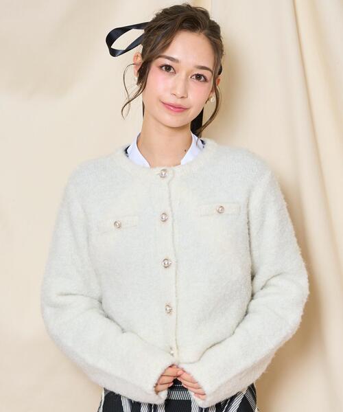 ふんわりとした肌触りと独特な風合いが魅力のニットジャケット【Design】・くるくるとした生地感がやさしい風合いを演出するループヤーンニットジャケット。・ライトアウターとしてや、カーディガンのように着回していただけます!・ツヤのあるパールボタンを添えることで、上品なエッセンスをプラス◎・ウエスト位置を高く見せてくれるコンパクトな丈感です。・フロントボタン仕様。【Fabric】・温かみのあるループヤーンを使用。・ホワイト、ピンク、チャコールの3色展開となります。【Care】ドライクリーニングF:(00):着丈44cm/身幅46cm/肩幅35cm/袖丈54cm/袖口幅12cm/裾回り90cm