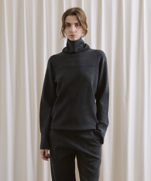 ADAM ET ROPE' EMOELLE◆2025-26秋冬◆ ADAM ET ROPE' EMOELLE 【Material】 ウールナイロンの総針編みのニットトップス。 透け感を抑えた適度な厚みの編地で、横の伸縮性も高く快適な着心地。 きちんと感も併せ持った編地に仕上げた1着。 【Design】 タートル襟のニットトップス。 襟はくしゅっとさせた着こなしがおすすめで、 袖カフスはシャツディティールを取り入れたデザイン。 裾は適度な位置で止まるように、裾巾を少し狭くして自然なブラウジングになるよう設計。 身巾はゆったりとさせてリラクシーな雰囲気を演出。 【Color】 チャコールとオフホワイトの2色展開。 【Styling Point】 同シリーズのウールニットパンツ(品番:GAS75530)とのセットアップで、大人な抜け感を纏ったスタイリングがおすすめ。 もちろんデニムやリーンスカートとも好相性。 --------------- 透け感:オフホワイトのみややあり 裏地:なし 伸縮性:あり 光沢感:なし 生地の厚さ:やや薄手~中肉 --------------- ◇モデル情報 身長:167cm size:F