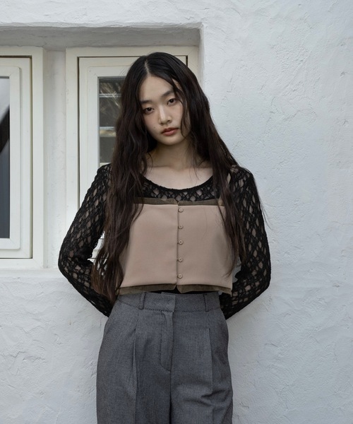 【ユーネックシアーレースメロートップス】・ほんのり透けるレースが、肌に透明感を纏わせるトップス・首元の抜け感が女性らしさを引き立て、手首や裾のメロウ加工が繊細なニュアンス感を演出してくれる一枚・デイリーにもお出かけにも合わせやすく、レイヤードで表情を変えられるシーズンレスに活躍するアイテム透け感:あり 伸縮性:あり