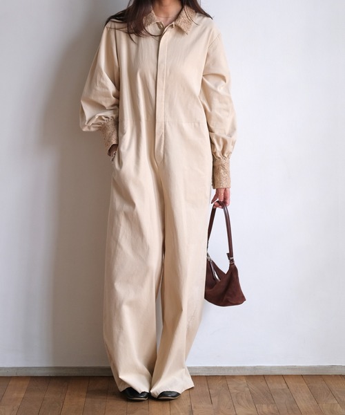 こなれ感のあるシルエットと女性らしさをプラスするレースディテールがモダンなジャンプスーツ 細畝の柔らかいコーデュロイ素材で仕立てたジャンプスーツ。 ボディラインを拾わないゆったりとしたシルエットで、リラックスして着ていただけます。 襟元と袖口に繊細なレースをあしらい、女性らしいアクセントをプラス。 一枚でコーディネートが完成する、カジュアルすぎず洗練されたデザインが魅力のアイテムです。 デートや女子会などのシーンにおすすめの着映えする一枚。 --------------------------------- 透け感:なし 裏地:なし 伸縮性:なし 光沢感:なし 生地の厚さ:普通 --------------------------------- ▼お取り扱い上の注意 ※お手入れの際は商品の縫込みネーム・アテンションを必ずご確認ください。 家庭洗濯〇(40℃限度。手洗いのみ) 漂白× タンブル乾燥× 日陰でのぬれ平干し アイロン〇(低温110℃まで。スチームアイロン×) ドライクリーニング〇(弱い処理。石油系溶剤) ウェットクリーニング〇(弱い処理) ・洗濯時、ネットを使用して下さい。 ・長時間水に浸漬しないで下さい。 ・洗濯の際は、軽く押し洗いして下さい。 ・生地の性質上、水洗いで多少のしわ、縮があります。 ・素材の性質上、多少収縮する可能性があります。洗濯後、形を整えて干して下さい。なお自動乾燥機(タンブラー)の御使用はおさけ下さい。 ・色落ちしますから他の物と分けて洗って下さい。 ・スチームアイロンは浮かしながら整形して下さい。 ・衿及び袖口のアイロンは低温。 ・ボタンにはアイロンをあてないで下さい。 この商品は、摩擦(特に湿った状態での摩擦)や、汗や雨などで濡れた時は他の衣料や下着(特に白)物に色移りする場合がありますので、十分ご注意下さい。 クリーニングの際は、多少色落ちすることがありますので、出来るだけ単品洗いをおすすめします。 また、他の淡色物に色移りすることがありますので、すみやかに処理(脱水・乾燥)するようお願いいたします。 以上の点を十分ご留意の上、お取扱い下さい。