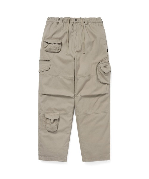 Regular fit バイオストーンウォッシュ加工 YKK #4.5 メタルジップフライ ドローコード付き伸縮性ウエストバンド ドローコード仕様の裾 左サイドにジップ付きカーゴポケット(隠しスナップフラップ) 右サイドに隠しメタルスナップ付きフラップポケット、ジップポケット併設 バックフラップポケット(隠しスナップ付き) 右前身頃に上下カーゴポケット(隠しスナップフラップ) プリーツ入りニー サイドシームにフラッグラベル thisisneverthat®(ディスイズネバーザット) 2010年に韓国・ソウルにて設立。アメリカや日本のファッションカルチャーに影響を受けた93年代の韓国ユースカルチャーをベースにしたストリートブランドです。 『最初にイメージして作ろうとした洋服は思い通りにならないものであり、それは結果的に求めていたものでもある』といった、 『this』と『that』は永遠に繋がらないという事をコンセプトにクリエイションを行っており、現代のトレンドをミックスしたコレクションを展開しています。