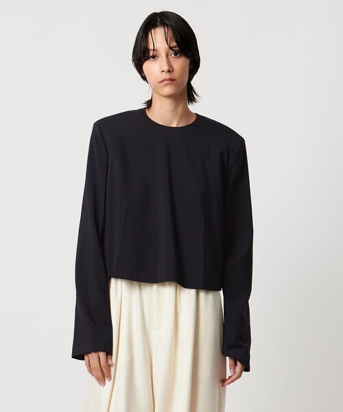 モードな着こなしが叶う、シンプルなパワーショルダーブラウス ■デザイン クルーネックのパワーショルダーブラウス。 ショート丈にボックスシルエットがモードな印象です。 身頃の裾部分と袖には、デザインポイントとしてプレスで折山をつけています。 後ろのファスナーの引手には長いテープを垂らし、さりげないアクセントに。 ■素材 2/27ウールのトロピカル生地を使用。 生地にハリを出す加工を施し、薄手でドライタッチな風合いに仕上げています。 ■コーディネート ボトムを選ばず、シンプルなアイテムを合わせてもモードな着こなしが叶います。 短めの着丈でバランスがとりやすく、きれいめにもカジュアルにも着こなせるアイテム。 今の気分にマッチする、ボトムレイヤードとも好相性です。 ============================ 裏地:あり 透け感:なし 伸縮:なし 光沢感:なし ケア方法:ドライクリーニング ============================ 【注意事項】 ※商品に「取り扱い上の注意書き」、「洗濯表示」がございます場合は、使用前に必ずご確認ください。 ※商品画像は、光の当たり具合やパソコンなどの閲覧環境により、実際の色味と異なって見える場合がございます。あらかじめご了承ください。 ※商品の色味の目安は、商品単体の画像をご参照ください。 ※画像の商品はサンプルです。実際の商品と色味、仕様、加工、サイズ、素材等が若干異なる場合がございます。 店舗へお問い合わせの際は、全国のUNITED ARROWS各店舗まで下記の品名/品番をお申し付けください。 品名:AM W P/SLD PRESS PO BLS 品番:87211000000