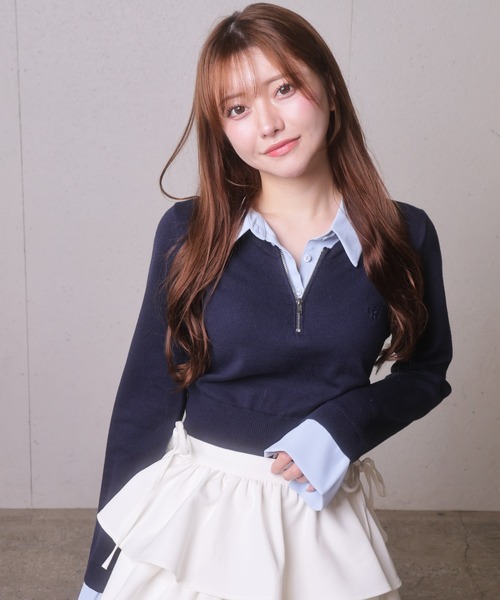 【point/coordinate】・取り外し可能なリボンタイ付き。リボンありでガーリー&華やかな雰囲気に、外せばファスナー部分が目立ちシンプルで大人っぽい着こなしが可能。・クラシカルな雰囲気を纏いつつ、カレッジ風コーデも楽しめるデザイン。・胸元にはさりげなくブランドロゴを刺繍し、ワンポイント見せ。・コンパクトな丈感で自然とスタイルアップし、着回しもしやすい。・身幅や袖はゆったりしたシルエットで、体型カバーしつつ着心地も抜群。●カラー・アイボリーはワントーンで統一され、シンプルながらも華やかな雰囲気に。・クレーはホワイトシャツ合わせで上品な配色。幅広く着回ししやすいカラー。・ネイビーはライトブルーのシャツがカレッジライクな印象。・ブラックは落ち着いたグレーチェックのシャツでクラシカルな雰囲気に。●スタイリング・プリーツスカートやフリルスカートなどミニボトムと合わせるとカレッジ風コーデが完成。・シンプルにデニム合わせでカジュアルコーデも楽しめる!▼おすすめのコーデアイテム000456500200 / サイドリボンフリルティアードミニスカート000456500030 / インナーショーパンツキチェックスカート