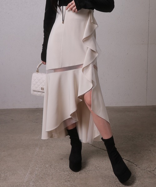 【point/coordinate】・フロントにあしらったラッフルが華やかでコーデの主役になるデザイン!・ラッフル部分はチュールを重ねることでさらにボリュームアップし目を惹く存在感。・シアーラインから肌が透け、女性らしさと抜け感を兼ね備えた仕上がり。・裏地はインナーショートパンツ仕様でシアーの位置が高めでも安心できる着用感。・左脚を見せるアシンメトリーデザインで、ロングアイテムでも重たくならず軽やかな印象。・ウエストの後ろはゴム仕様でストレスフリーな着心地。●カラー・アイボリーとブラックは合わせやすいベーシックカラー。・ミックス1はギンガムチェック柄でトレンドライクな存在感。●スタイリング・ボリュームのあるデザインなのでシンプルなトップスを合わせるだけで華やかなコーデに。・足元はショートブーツでバランス良く仕上げるのがおすすめ。▼おすすめコーデアイテム000456010420 / アシメオフショルストラップニット000455850350 / ボリュームソールショートブーツ【fabric】・伸縮性に優れたハイストレッチ生地を使用し、しっかりフィット!・さらっとした表面感でシーズンレスに取り入れやすい素材。・チュールは編み目が細かく柔らかいので動くたびに軽やかな揺れを演出。