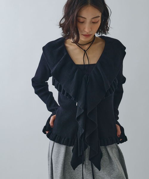 ラッフルで華やぐ、細見えカーディガン ■Fabric 顔まわりを華やかに演出するラッフルカラーのリブニットカーディガン。 V字にあしらわれたフリルラインが縦のラインを強調し、細見え効果を発揮! さらに、程よいフィット感で細腕効果も◎ リブ編みはテンションを緩めに仕上げており、着心地の良さにこだわったアイテムです! ■Style ワイドパンツやハーフパンツなどワイドシルエットなボトムとの相性が良く、おすすめ◎ 前を閉じてトップス風に着れば、フェミニンな印象に。 羽織りとして使えば、カジュアルなデニムスタイルにも程よい甘さをプラスするのも◎ 160cm(着用サイズ:フリーサイズ) 168cm(着用サイズ:フリーサイズ)※ショートヘア ------------------------------------- 透け感:なし 伸縮性:あり 厚み:普通 洗濯:可 -------------------------------------- ※商品の特性上、色落ち・色移りがある場合がございます。品質表示をご確認の上、お取り扱いにはご注意くださいませ。 ※撮影時のライティング、ご覧になっているモニター・PC環境により実際の商品と色味が異なって見える場合がございます。ご了承の上お買い求め下さい。 ※サンプルにて撮影をしている為、色味や仕様、サイズ等に若干の変更がある場合がございます。予めご了承ください。