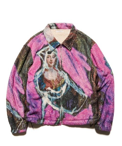 今シーズンのUEでは、かつてマルコム・マクラーレンや藤原ヒロシ氏にも多大な影響を与えたパンクの源流的思想家であり、芸術家でもあるアスガー・ヨルンにフィーチャーしたシリーズを展開。こちらは2種のヨルン作品を全面に転写プリントしたマイクロファイバーフリースのブルゾン。ガレージセールで買った油絵の上に描かれた作風がどこか今季のテーマ“UNFINISHED”に通じます。