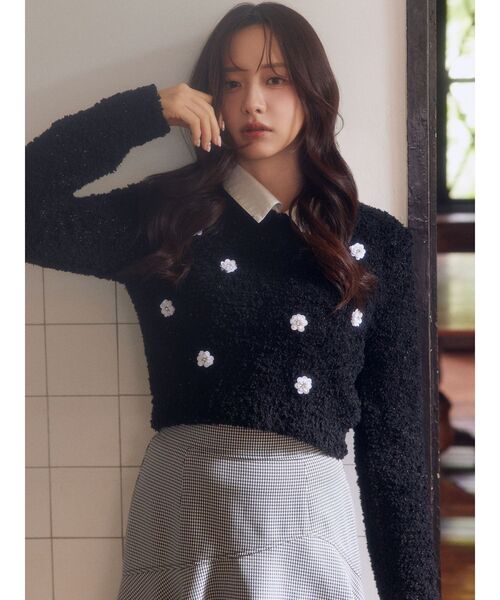 展示会でも人気だったシャツドッキングニット▽デザイン▽トレンド感ある花のモチーフがポイントのニット。起毛感ある糸を使用し冬のムード感溢れるデザインニットに仕上げました♪襟は取り外し可能になっているので、クルーネックの状態でも着用できる2WAY仕様!ショート丈なのでコーデのバランスが取りやすいデザインニットです。▽カラー▽白・黒・チャコールグレーの3色展開。▽スタイリング▽ハイウエストボトム合わせがおすすめ!スカートからパンツまで、様々なアイテムと好相性でアウターを羽織ってもフロントのモチーフデザインがアクセントに。