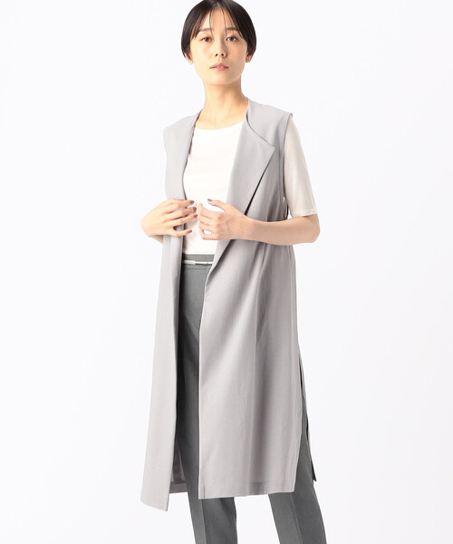 「大人カジュアルスタイルには欠かせないジレ」《デザイン》ノーカラーのきちんと感のあるロングジレです。後身頃をシフォンにし、シアー感のある涼し気な印象です。共地のベルトもアクセントになっています。脇は縫い合わせではなく、深いスリットのように開いているため、抜け感もあります。Tシャツ等、ラフになりがちなこれからの季節のコーディネートに一枚羽織るだけでさまになる便利なアイテムです。《素材》夏に向けて清涼感のある肌離れの良いTシャツ地です。ポリエステルを入れることでしわになりにくく、お手入れしやすい素材です。別地シフォンは、程良い透け感とふわりとした軽さを持つシフォンジョーゼットです。適度なマット感でソフトな風合いの素材です。別地カットソーは、暑い季節にぴったりの柔らかで肌触りの良いTシャツ素材です。表面を加工で毛羽を落としたきれいな表面感と、繊細な素材感が特徴のコットン天竺です。お手入れ方法:手洗いOK「暑い日にピッタリなお仕事コーディネートです」