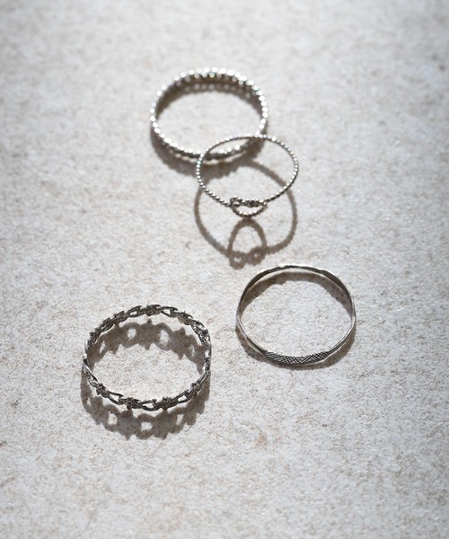 重ねて楽しむ、ノット&チェーンデザインリング《POINT》華奢ながらもしっかりと存在感を放つ、4本セットのリングです。結び目モチーフのノットリング、チェーン風デザインの2種類、そしてツチメ模様を施したリングと、それぞれ異なる表情を楽しめるデザイン。4本をまとめて重ね付けするとバランス良く華やかに、1本ずつでも上品に着けられるのが魅力。お手持ちのリングとのコーディネートにも重宝します。経年変化による色味や艶の移ろいも風合いとしてお楽しみいただける、大人のためのリングセットです。※ATTENTION※使用していくうちに汗や皮脂、環境、異物の付着などによって変色などの経日変化がございます。なるべく空気に触れないように、使用後は乾いた布等で拭いてから保管ください。マット仕上げの加工は、色や艶に微妙な差がございますので、ご了承くださいませ。マットの仕上げは使用していくうちに、だんだんとツヤが出てくるなど経日変化がございます。そういった変化もそれぞれ、風合いとしてご理解いただけますと幸いです。※PC環境によって、現物と画像の印象が異なる場合があることもご了承くださいませ。【Ljud/ユード】collexオリジナルのブラスアクセサリー。日本では古くから使われてきた真鍮を職人の手仕事により、ひとつひとつ表情を付け仕上げられています。