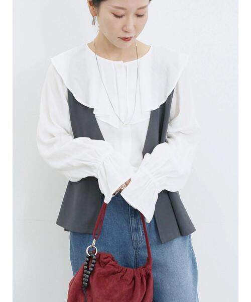 ひらりとなびくラッフルカラーのデザインが施されたブラウス。 袖口はキャンディースリーブになっており、立体感のあるシルエットが魅力的です。 レーヨンを含むさらりとした素材感がポイント。 季節の変わり目のお出かけスタイルに重宝したいアイテムです。 ※商品画像は、撮影環境やお客様のご利用のPC・スマートフォンのモニター環境などにより実物と色味に差異がある場合がございます。 【その他採寸】 F 着丈:[前]63cm[後]68.5cm