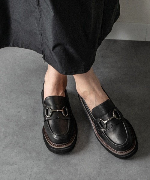 【INTER-CHAUSSURES/ インターショシュール】 デザイン性と履きやすさを兼ね備えたラインナップに、エッジを利かせたファッショナブルなセレクトで人気のINTER-CHAUSSURES(インター ショシュール)。 グローバルな視点とコンセプチュアルな個性が光るシューズセレクトブランドです。 厚底ビットローファーは、アッパーには撥水加工を施し、急な悪天候にも対応可能です。 軽量でクッション性に優れたEVA素材と耐摩耗、グリップ力に優れたラバー素材を組み合わせた防滑モールドソールを採用しています。 ソール中央のラバー部分には低温の環境下で硬化しスパイク的な効果を発揮する特殊ラバー(緑色部分)を配合し、氷上でのグリップ力を高めています。 ※撥水加工は永久的なものではありません。縫い目等、製法上の隙間があり完全防水ではない為、こまめに防水スプレーをかけることをお勧めします。 <素材詳細> 【ブラック】甲;羊革 .ソール;合成樹脂/合成ゴム 【ブラック系その他,ブラック系その他2】甲;牛革 .ソール;合成樹脂/合成ゴム [INTER-CHAUSSURES/サイズ目安] 35 約22.5~23.0cm 36 約23.0~23.5cm 37 約23.5~24.0cm 38 約24.0~24.5cm 39 約24.5~25.0cm ※靴裏に保護シールが貼ってある場合がございます。ご着用の際は剥がしてご使用ください。また検品の際に保護シールを一部剥がす場合がございます。予めご了承ください。 ※生産過程に生じるキズが多少ある場合がございます。また若干の色ムラ、擦れが見られる場合がございますが、こちらは素材の特性となります。 ※輸送中に多少箱が破損する場合がございます。 ※サイズ換算(表記)はあくまで目安となります。