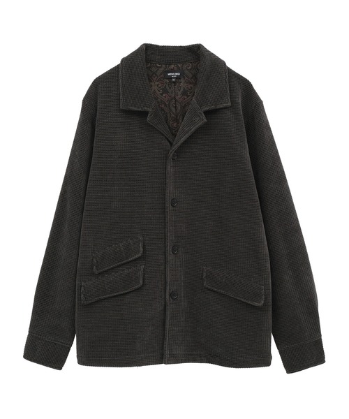 【表情豊かな素材が魅力のカバーオールジャケット】 ポリエステル100%のコールワッフル素材を使用したカバーオールジャケット。 ベロア調の糸で編み込むことで生まれる奥行きのある表面感と光沢が特徴で、カジュアルながらも上品なスタイルを演出します。 【デザイン/素材】 ポリエステル100%のコールワッフル素材を使用。 ベロア調の糸をワッフル組織に編み込むことで、光沢感と凹凸感のある独特な表面に仕上げました。 シンプルなデザインながら、素材の奥行きが高級感を演出します。 【シルエット】 ぴったりすぎないスタンダートシルエット。 さっと羽織るのに便利なサイズ感で、カジュアルにもきれいめにも、幅広いスタイルで活躍します。 【ディテール】 クラシカルなカバーオールのディテールを取り入れ、オープンカラーでこなれたカジュアル感を演出しました。 デザインのアクセントとなるフラップ付きのポケットは、チェンジポケットのデザインで右のフロントに2つ、左に1つ付いています。 袖口にはボタン付きの開きがあり、気温やコーディネートに合わせてターンバックしやすいのもポイント。 また、背裏にはペイズリー柄の生地を使用しており、脱いだ時にもさりげないおしゃれを楽しめます。 モデル:身長:185cm バスト:90cm ウエスト:77cm ヒップ:92cm 着用サイズ:03(L) ※照明・光の加減、PCやスマートフォンなどの環境により、製品と画像のカラーの見え方が異なる場合がございます。 ※画像はサンプルのため、色味やサイズ等の仕様が変更になる場合がございます。 ※サイズは弊社規定の採寸によって記載しておりますが、若干の個体差が生じる場合がございます。