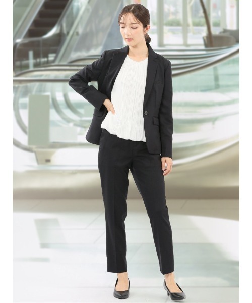 エムエフエディトリアルレディース/m.f.editorial:Women ストレッチウォッシャブル 1ボタンジャケット+テーパードパンツ シャドーストライプ黒 ■素材特徴 ストレッチ性に優れたポリエステル生地を使用しています。控えめなシャドーストライプの織り柄、サラッとした着心地、防シワ、ウォッシャブル機能が特徴です。裏地はポリエステルのストレッチ生地です。 ■機能 【ストレッチ】表地・裏地共に伸縮して、ストレスフリーな着心地。 【マシンウォッシャブル】洗濯機で洗えます。(要ネット・弱水流) 【UVカット】紫外線を通しにくい生地を使用することでお肌を守ります。 【イージーケア】洗濯後もシワが入りにくく、アイロン掛けも簡単。 ■デザイン テーラードジャケットは一つボタンですっきりとしたルックスに仕上げています。袖口は着脱がスムーズなスリット入りで、折り返しても着用可能です。左胸ポケット・フラップポケット・内ポケット付きです。ノータックのテーパードパンツは裾に向かって細くなるシルエットです。ウエストはサイドシャーリング仕様で着用ストレスを軽減。センタープレス加工、前ファスナー仕様、ベルト通し付き、前後ポケット付き、裾部分は加工済みです。(S:66-XL:69cm・シングル仕上げ) ■シルエット ジャケットはボディラインに自然に沿ったベーシックなシルエットです。パンツは腰回りや太ももは程良くゆとりがあり、裾に向かって細くなるテーパードシルエットです。 ■コーディネート インナーには定番のドレスシャツや、柔らかなシフォン系のブラウス等がおすすめです。オフィスシーンはもちろん、プライベートやセミフォーマルに、オンオフ兼用で活躍してくれます。 フィット:ベーシック シーズン:秋冬 展開カラー:黒(ブラック) 上着裏地:総裏仕様 組下裏地:無し *アテンションタグ・洗濯ネームを御確認の上、着用又は取り扱い下さい。 *光の当たる場所や高温多湿になる場所での保管は避けて下さい。 *使用の有無に関わらず、経年劣化は進行いたしますのでご了承下さい。 * ZOZOTOWN お買い物ガイド ・商品のお気に入り登録 ハートマークをクリックしましょう!完売カラーの再入荷通知や、ラスト1点の通知、セールの通知をお知らせします。 ・ブランドのお気に入り登録 新商品や再入荷など、いち早くお得な情報を受け取ることができます。 ・最短で翌日お届け 商品をカートに入れた後、注文内容の確認ページで「即日配送」を選択していただければ、最短でご注文した翌日にお届け致します。 (ZOZOTOWNお買いものガイドをご参照ください) *裾上げ等のお直しが必要な場合は、ZOZOTOWN納品書をご持参していただき最寄のタカキューグループ店舗までお持ちください。 お直し代金 お直しにかかる期間は店舗によって異なる場合がございますので、詳しくは店舗スタッフまでお問い合わせください。 面接 セミフォーマル セレモニー ビジネス オフィス 出張 営業 セットアップ オフィスカジュアル ビジネスカジュアル 通勤 新生活 婚活 記念日 授業参観 参観日 プレゼント・ギフト ベーシック 定番 20代 30代 40代 アダルト シニア 等幅広いシーンやスタイルに活躍してくれます。