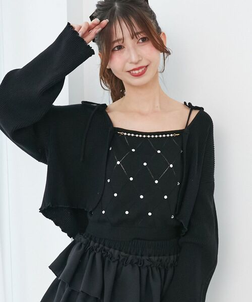 ビジューの輝きで華やぐ、大人のフェミニンニットセット■デザインフロントに繊細なビジューチェーンをあしらったカーディガンと、透かし編みのダイヤ柄にビジューを散りばめたキャミソールがセットになったアイテム。女性らしさを引き立てる華やかなディテールで、シンプルながら存在感のあるスタイリングが叶います。さりげない肌みせでヌケ感をプラスしつつ、女っぽさもしっかり演出。セットでの着用はもちろん、単品使いでも旬のスタイルが楽しめる万能アイテムです。■サイズ感カーディガンはゆとりのあるサイズ感。キャミソールは程よくフィットするサイズ感です。どちらも伸縮性があるので着心地抜群です。■スタイリングセットでの着用はもちろん、単品でも着まわせる万能アイテム。デニムでカジュアルにヌケ感を出したり、ミニスカートと合わせて女っぽさを引き立てる着こなしがおすすめです。・・・・・・・・・・・・・・・・・・・・・・透け感:なし裏地:なし伸縮性:あり光沢感:なし生地の厚さ:普通・・・・・・・・・・・・・・・・・・・・・・■商品のお気に入り登録:再入荷通知やのこりわずか、お得なプライスダウンの情報も受け取ることができます。ぜひご登録ください◎※サンプルでの撮影の為、製品と仕様が異なる場合がございます。※商品の色味は、撮影場所や光のあたり具合などにより色味が違って見える場合がございます。また、お客様のお使いのモニター環境などにより色味が異なって見える場合がございます。予めご了承の上ご注文下さい。