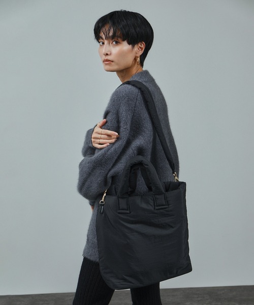 大容量と機能性を備え、デイリーに活躍。軽量ナイロンと中綿入りでふんわり感が魅力の2WAYトートバッグ■デザイン/シルエット ふんわりとした中綿入りの縦長2WAYトートバッグ。 ショルダーはナスカン金具で取り外し可能。 太めのハンドルとショルダーで重い荷物も快適に持てます。 大きめのメッシュポケット2つ、小物用ポケット2つ、 貴重品に安心なファスナーポケット1つを備えた収納力も魅力。 ミニマルなデザインでオンオフ問わず使える万能アイテムです。 カラーはブラックとダークベージュの2色展開。 ■素材 表地・裏地ともに軽量ナイロンを使用。 ワッシャー加工によるカジュアルな風合いが特徴。 中綿入りでふんわりとした立体感を演出し、 付属部分にはスムース人工皮革を使用しています。 ■パフナイロンシリーズ一覧 ・商品番号:SHX45290 商品名:【WEB限定】軽量パフナイロン2WAYショルダートート ・商品番号:SHX45250 商品名:【WEB限定】軽量パフナイロンワンハンドルトート ----------------------------- ポケットの数:中3個 A4収納:可 PC収納:13インチ可 ショルダー紐:あり(取り外し可) 容量:12L -----------------------------