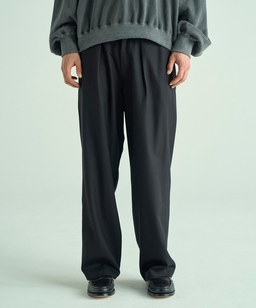 ポリエステルにレーヨンの滑らかさとウールの程よい温かみをブレンドした生地を使用したワイドイージーパンツ。高密度な圧縮フラノ素材により、柔らかな触感を保ちながらもしっかりとした存在感を感じさせます。寒い季節でも心地よい温かさを提供しつつ、軽やかな着心地を保ち、上品で落ち着いた印象を与える一着です。ウエスト部分には背面のみゴム仕様を採用。イージーパンツの快適さを維持しながらも、正面からのすっきりとした印象を実現しています。快適な着心地を兼ね備え、日常使いやカジュアルシーンにぴったりなアイテムです。VICTIMVICTIMとは“FASHON VICTIM”、直訳では“流行の犠牲者“という意味になるが、ブランドとしては“ファッションに没頭する“という意味合いを持たせており、“追求=VICTIM”をブランドコンセプトとしている。デザイナーがこれまでの洋服に関わる人生の中で追求してきた結果、着心地と形の良いもの、そしてデザインをなるべく省いたもの、それこそが長く着ていける洋服=VICTIMとしている。今シーズンも、ビクティムが得意なリラックスシルエットのアイテムが豊富。セットアップ展開のジャケットとスラックスやワイドシルエットのパンツ、ビッグシルエットのスウェットトレーナーのアイテムやCA4LA(カシラ)とのコラボレーションアイテム等もラインナップ。