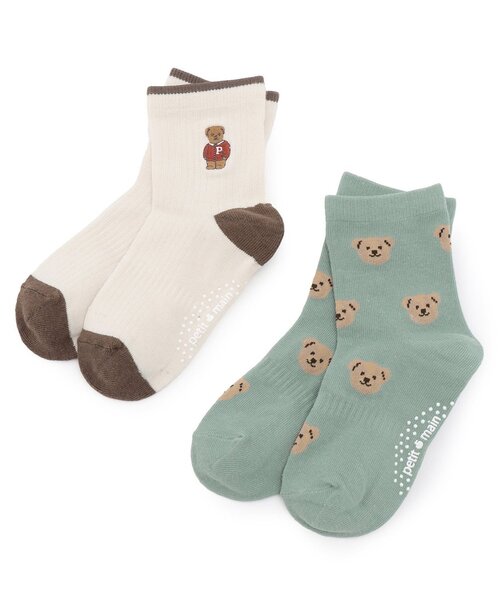 愛らしい表情のくまをデザインしたソックスのセットです。 普段使いしやすいワンポイントと個性的な総柄の2枚組。 かかとにしっかりとフィットする、脱げにくい設計になっています。 はき口の内側にお名前を記入できるのもうれしいポイント。 足底にはブランドロゴのすべり止めがついています。