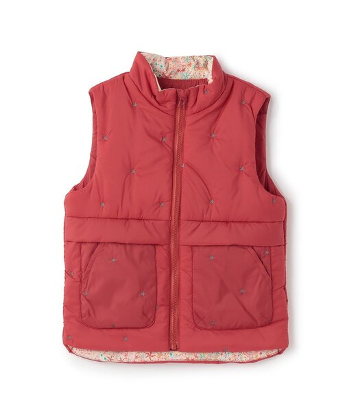 リバティファブリックスの「Adelajda(アデラジャ)」を取り入れたベストです。表地は星を刺しゅうした煌びやかなデザインになっています。吸湿と発熱の機能を備えており、寒い季節のお出かけにおすすめ。ご自宅でお洗濯できるのもうれしいポイントです。内側にお名前を記入できるタグつき。【透け感】透けない【生地の厚さ】普通【伸縮性】なし【裏地】あり【ポケット】なし【アジャスター】なし