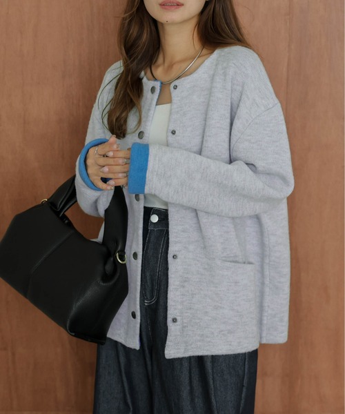 トレンドの配色デザインが映える ニットカーディガン 裏面のカラー配色がおしゃれ見えするニットカーディガン。 袖口をまくって裏面を見せると配色が見えて垢抜けた印象に! 前を閉めてトップスのように着たり、羽織りとしても◎ 豊富なカラバリに、目を惹く配色デザインが映えるアイテムです。 Point 01 こなれ感満載のゆるっとシルエット ほどよいビッグシルエットで 抜け感を演出。 ヒップの隠れる丈感で、 体型カバーしつつ、華奢見せ。 フロントの大きめなポケットが アクセントになり、 大人カジュアルにキマるアイテムです◎ Point 02 目を惹くバイカラーデザイン 飾らないシンプルなデザインながら、 発色の良い裏面配色が コーディネートのポイントに。 長めに作った袖は、あえて折り返し、 裏面のカラーをアクセントに◎ 【25AW】 ■Fabric ふんわり柔らか 肌触りの良いニット生地 チクチク感の少ない、もっちりした生地感。 --------------------- 透け感:なし 裏地:なし 厚さ:普通 伸縮性:あり --------------------- ▼《お気に入り登録》でお得な情報がいっぱい▼ ・「商品のお気に入り登録」で再入荷通知や、ラストの通知、セール通知も受け取ることができます。 ・「ブランドのお気に入り登録」で新商品や再入荷など、お得な情報を受け取ることができます!