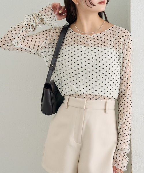 1枚で決まる◎着回しも万能◎ドット柄が目を惹くトップスが登場! ●デザイン ・ふんわりと軽やかな印象のドット柄シアートップス。シアー素材ならではの透け感で抜け感と軽やかさをプラスしました。 ・シンプルなアイテムにプラスするだけでコーディネートにアクセントを与え、トレンド感あふれるスタイルが完成します。 ・伸縮性もあり柔らかく肌触りが良いのもポイントです◎ ●スタイリング ・シアー素材で透け感のあるアイテムなので、インナーとしてキャミソールを重ねるのがおすすめです。 ・ドット柄でデザイン性のあるアイテムのため、デニムとの相性抜群◎ ・ボトムスはシンプルなアイテムと合わせるのがポイントです。 ・ニットやスウェットのインナーとして着用し、ドット柄が見えるとよりトレンド感が出ます! ●おすすめスタイリングアイテム ・ウェーブデニム ・金ボタンテーラードジャケット ・襟付きプレートニットカーディガン ・スクエアネックニットカーディガン ●店頭で人気コーディネートTOP3! 1位 ドットレースプルオーバー×襟付きプレートニットカーディガン(MYZ1052405A0005)×プレート付きニットパンツ(MYZ1052402A0001) 2位 ドットレースプルオーバー×ポコポコニットカーディガン(MYZ1052205A0003)×ウェーブデニム(MYZ1051603A0001) 3位 ドットレースプルオーバー×フーディーニットショートパーカー(MYZ1052205A0004)×バルーンロングスカート(MYZ1052101A0011) ●スタッフ着用コメント ・身長153㎝ 骨格ウェーブ シンプルなアイテムと合わせるだけでドットの存在感が出て可愛いです。 透け感のある素材なのでヘルシーさをプラスしてくれます。 ・身長160㎝ 骨格ストレート 1枚使いでもインナー使いでもどちらも使えるトップスなので持っているとたくさん着回しができるアイテムです! インスタイルも叶う丈なのも嬉しいです。 ●Q&A Q.チクチクしたり痒くないですか? A.柔らかいシャーリングの素材なので、チクチク感も無く着心地が良いです。 Q一枚で着たいのですが、透け感気になりますか? A凹凸の表面感がある素材の為、肌の透け感を馴染ませてくれるので一枚で着ても安心です。 ●素材 ナイロン×ポリウレタンを使用。ストレッチ性がある生地です。 ----------------------------------------------------- 洗濯:40度限度 手洗い/石油系ドライクリーニング可 アイロン:低温120℃まで スチームなし(あて布使用) タンブル乾燥:不可 裏地:なし 伸縮性:あり 光沢感:なし 生地の厚さ:うすめ ------------------------------------------------------ 商品のお気に入り登録➡ お気に入りアイテムの値下げ・再入荷・在庫1点などの通知を受け取ることができます。 ブランドのお気に入り登録➡ 新商品や再入荷、セール、クーポン配布などお得な情報を受け取ることができます。 ※サイト上のカラー名と、お届け商品に記載されているカラー名が異なる場合がございます。 ※商品の色味は、撮影場所や光のあたり具合などにより色味が違って見える場合が御座います 。 また、お客様のお使いのPCのモニター環境などにより色味が違って見える場合が御座います。予めご了承の上ご注文下さい。 ※ご注文いただいた予約商品のお届け時期の確認は、注文履歴ページより行えます。 ------------------------------------------------------