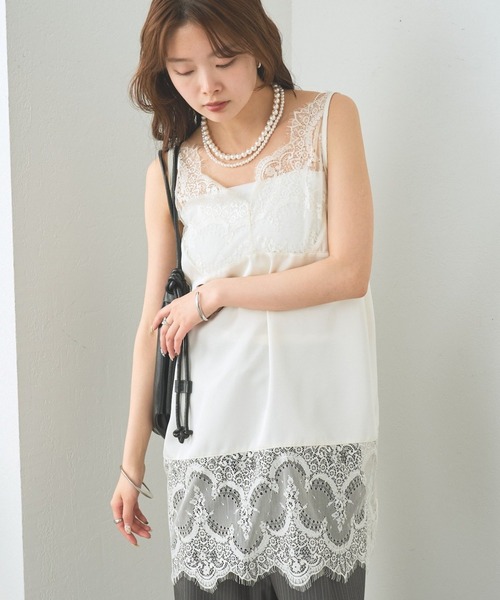 レイヤードコーデが叶う◎トレンド感満載なアイテムが登場! ●デザイン ・サテン生地×レースが今年らしいランジェリータッチなレイヤードアイテム。 ・ジャケットやカーディガンの下に、このアイテムをレイヤードさせるだけでこなれた雰囲気をプラスしてくれお洒落さがアップします。 ・肩紐はアジャスターがついているので調節可能なデザインとなっております! ●スタイリング ・ジャケットを羽織って洗練された大人のコーディネートに。 ・カーディガンをレイヤードさせる着方もおすすめで、首回りのレースが程よく見えるのがポイント◎ ・ミニボトムスを履いてワンピース風に着るのも。足元はロングブーツ×ソックスでトレンド感のあるコーディネートに♩ ・足元はパンプスやローファー合わせがおすすめです。 ●おすすめスタイリングアイテム ・ビューティーフレアデニム ・【オケージョンにも◎/3色展開】金ボタンテーラードジャケット ・【今一番売れてるトップス!4色展開◎】起毛リブボタンカーディガン ●スタッフ着用コメント ・身長155㎝ 骨格ウェーブ 骨格ウェーブで腰回りが気になることが多いのですが、ワイドすぎずタイト過ぎないないので気にならずに着ることができました◎ つや感のあるサテン生地で高級感もあって裾や胸元のレースが華やかで可愛いです! ・身長162㎝ 骨格ナチュラル 簡単にレイヤードコーデが完成するアイテムです♩ サイズフリーですが肩紐のアジャスターで調節できるので丈感もピッタリで着ることができました。 ●素材 滑らかなさらっとした生地です。 ----------------------------------------------------- 洗濯:40度限度 手洗い/石油系ドライクリーニング可 アイロン:低温120℃まで スチームなし(あて布使用) タンブル乾燥:不可 裏地:なし 伸縮性:なし 光沢感:なし 生地の厚さ:うすめ ------------------------------------------------------ 商品のお気に入り登録➡ お気に入りアイテムの値下げ・再入荷・在庫1点などの通知を受け取ることができます。 ブランドのお気に入り登録➡ 新商品や再入荷、セール、クーポン配布などお得な情報を受け取ることができます。 ※サイト上のカラー名と、お届け商品に記載されているカラー名が異なる場合がございます。 ※商品の色味は、撮影場所や光のあたり具合などにより色味が違って見える場合が御座います 。 また、お客様のお使いのPCのモニター環境などにより色味が違って見える場合が御座います。予めご了承の上ご注文下さい。 ※ご注文いただいた予約商品のお届け時期の確認は、注文履歴ページより行えます。 ------------------------------------------------------
