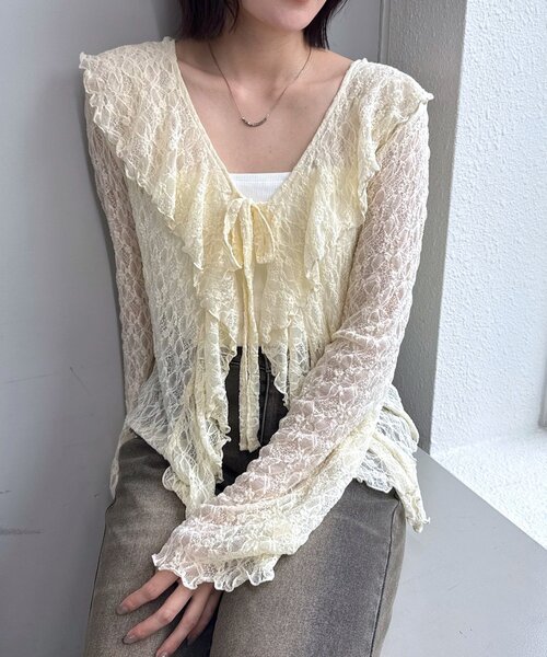 胸元の大きめフリルが目を惹く◎華奢見え抜群なブラウスが登場!〇商品コメント・繊細なレースのデザインが綺麗さを引き立たせるアイテム。・肌触りの良い柔らかな素材は、着心地も抜群。・Vネックのデザインに、たっぷりと施されたフリルが女性らしい柔らかな印象を与えてくれます◎〇スタイリングポイント・デニムやワイドパンツと合わせればカジュアルなスタイルに◎・ミニ丈やロングブーツ合わせもおすすめ。※洗濯、取り扱い洗濯:40度限度 手洗いアイロン:低温120℃まで(あて布使用)タンブル乾燥:不可漂白:不可-----------------------------------------------------裏地:なし伸縮性:なし光沢感:なし生地の厚さ:うすめ------------------------------------------------------ 商品のお気に入り登録➡ お気に入りアイテムの値下げ・再入荷・在庫1点などの通知を受け取ることができます。ブランドのお気に入り登録➡ 新商品や再入荷、セール、クーポン配布などお得な情報を受け取ることができます。 ※サイト上のカラー名と、お届け商品に記載されているカラー名が異なる場合がございます。 ※商品の色味は、撮影場所や光のあたり具合などにより色味が違って見える場合が御座います 。 また、お客様のお使いのPCのモニター環境などにより色味が違って見える場合が御座います。予めご了承の上ご注文下さい。 ※ご注文いただいた予約商品のお届け時期の確認は、注文履歴ページより行えます。------------------------------------------------------
