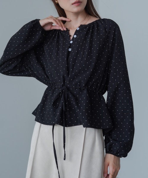 ●Bab● ■POINT細かなドット柄とウエストのシャーリングが女性らしさを引き立てる、大人フェミニンなブラウス。フロントにはボタンが並び、腰回りにはリボンがあしらわれているため、自然にウエストマークされてすっきりとしたシルエットに仕上がります。甘すぎないドット柄と上品なディテールで、オフィスカジュアルにもぴったりの一枚。オン・オフ問わず着回し力の高いアイテムです。カラーはアイボリー・ブラウン・ブラックの3色展開。アイボリーは軽やかで華やかに、ブラウンは落ち着きがありクラシカルに、ブラックはドットが映えてシックな大人フェミニンに。色ごとに印象が変わるので、シーンに合わせて選べるのも魅力です。 ■FABRIC レーヨン特有のなめらかな落ち感と、ポリエステルの軽さや扱いやすさを兼ね備えた素材感です。さらりとした肌触りで着心地がよく、きれいなドレープが出るため、ドット柄も上品に見える仕上がりです。 ■COORDINATE センタープレスパンツやタイトスカートと合わせるときちんと感のある上品なオフィスカジュアルになります。デニムやサテンスカートと合わせて、軽やかで華やかなフェミニンカジュアルスタイリングもおすすめです。 ………………… 透け感:ややあり 裏地:なし ………………… ※撮影環境により、多少実際のカラーと異なる場合がございます。また、携帯やスマートフォン、パソコンなどの画面上と実物では多少色が異なって見える場合がございます。ご了承下さいませ。 ※画像の商品はサンプルのため、実際の商品と若干仕様が異なる場合がございます。 ※濃色品は、過度な摩擦や濡れた状態での摩擦により、色落ち・色移りをする恐れがあります。 ※この商品は、素材の特性上、洗濯の際に多少の縮みが生じる恐れがあります。洗濯後は形を整えてから干してください。 ※その他お取り扱いに関しましては、商品に付属のアテンションタグをご覧ください。 ★商品のお気に入り登録 再入荷やラスト1点のお知らせ、セール情報などお知らせを受け取ることができます! ★ブランドのお気に入り登録 新商品や再入荷などのお得な情報を受け取ることができますので、是非ご登録ください。 ★Bab公式Instagramアカウント【bab.showroom】で最新情報をチェック!
