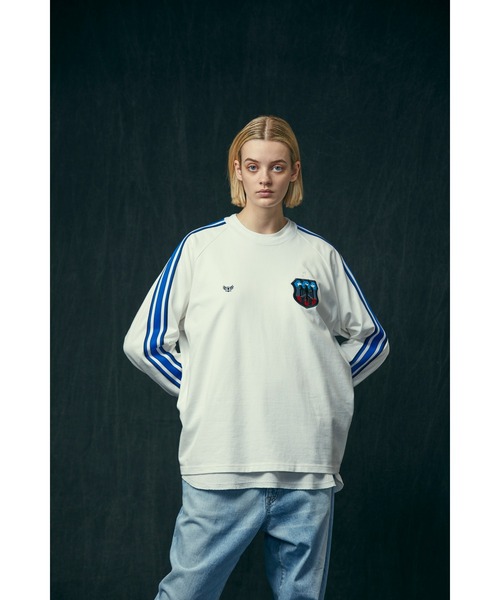 ■クルーネックのロングスリーブトラックシャツ。クラシックなサッカーウェアの雰囲気を纏う一着。肩から袖にかけてラインテープ、左胸にはワッペンが配置されています。袖口はリブ仕様。スポーティーさを活かしたコーディネートを楽しみたいアイテムとなっています。