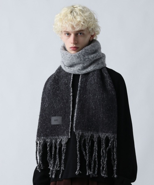 ーーー WEB限定 グラデーションカラーとふんわりとしたやわらかい肌触りが特徴のシャギーマフラー ーーー POINT □表裏でグラデーションの色味が違い、気分によって楽しめるカラーリング。合わせやすいカラーを選定し、デイリーにご使用いただけます。 □毛足が長く、空気を含んだようなふんわり感が特徴のシャギー素材を使用。顔まわりにボリュームを持たせることで、小顔効果も期待できます。 □スタイリングは自由自在。長さがあるので首元にぐるっと巻くのはもちろん、肩から羽織ったり、コートの上からさっとかけるだけでもサマになります。これ一つで、いつもの冬コーデを何通りも楽しめます。 □フェイクレザー部分にロゴを加え、ワンポイントに。