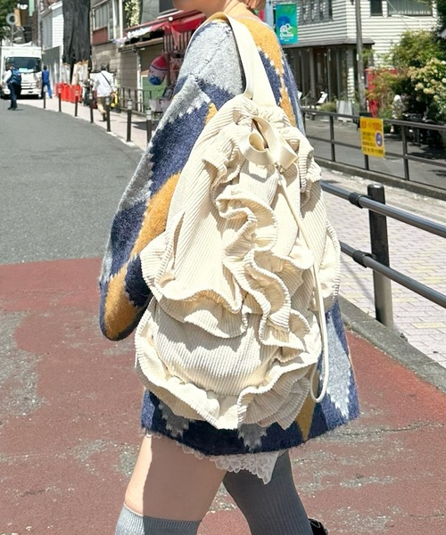 【director's voice】 キャセリーニさんのオリジナルのフリフリリュックがとっても可愛かったので、 アリーらしい雰囲気に落とし込めたらいいな、と、思い、 ちょっと古着感のある、秋冬らしい太畝のコーデュロイ、しかもコーデュロイと言えばやっぱ可愛いのはエクリュー!!の1択で、作りました。 大容量で実用的!且つどんなスタイリングにもスッと華を添えるオシャレさ! 大好きなリュックが出来ました
