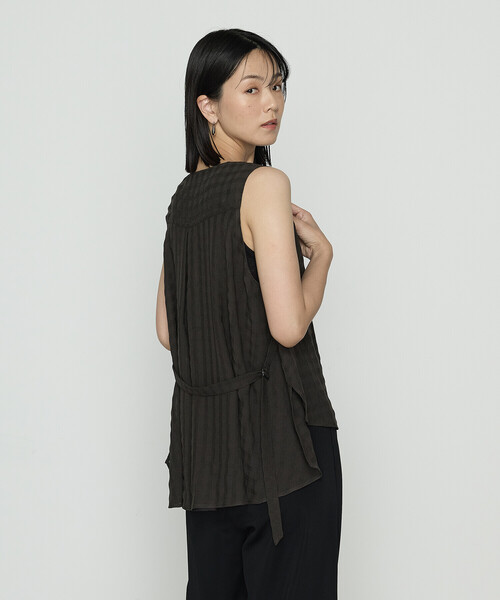 《デザイン》Tシャツ一枚ではラフすぎるかしら‥という時にさっと羽織るだけで上級コーディネートが完成します。生地のドレープが美しいジレです。前身頃は襟が表に返っても内側に折れてもきれいに決まるように計算されています。後ろ身頃はさらにたっぷりのドレープが背中やお尻の嫌な部分を隠してくれます。アクセントにつけた後ベルトはぎゅっと締め付けないのがポイントです。フロントを閉めたい方のために同色のカギホックを一つ付けてあります。《素材》夏の定番素材のカラミ織りです。涼しさを感じる生地は綿や麻で織られることが多いのですが、今回ギャバジンK.Tではポリエステルとレーヨンの糸で織り上げた生地にしています。涼しいうえにしわになりにくいイージーケアです。チェック柄でおしゃれ度もアップの新しい生地です。お手入れ方法:手洗い可能