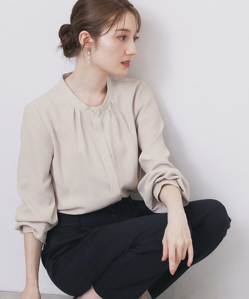 バイカラーパイピングが効いているバンドカラータックブラウス【デザイン】・バンドカラーが特徴的で、シンプルながらも洗練された印象を与えます。・フロントのタックデザインが、立体感を生み出し、女性らしいシルエットを強調。・バイカラーのパイピングディテールがアクセントとなり、全体を引き締める効果があります。・長袖のデザインが、季節感を感じさせつつも、エレガントな雰囲気を演出。・背面はさりげないタックデザインで、どんなスタイルにも合わせやすいのも嬉しいポイントです。【素材】・柔らかなジョーゼットの合繊生地を使用し、快適な着心地を実現。・軽やかで落ち感のある素材で、きれいな状態を保ちやすいのも魅力的です。・洗濯機でのお手入れが可能で、日常使いに最適なアイテムです。※照明の関係により、実際よりも色味が違って見える場合があります。また、パソコン・スマートフォンなどの環境により、若干製品と画像のカラーが異なる場合もございます。モデル情報:身長163cm B81 W56 H82 着用サイズ:38(M)店舗へのお問い合わせ商品番号:C58-84008●製品寸法:36(S):着丈59cm B94cm 袖丈57cm 肩幅34cm38(M):着丈60cm B97cm 袖丈58cm 肩幅35cm40(L):着丈61cm B100cm 袖丈59cm 肩幅36cm42(LL):着丈62cm B104cm 袖丈61cm 肩幅38cm備考: