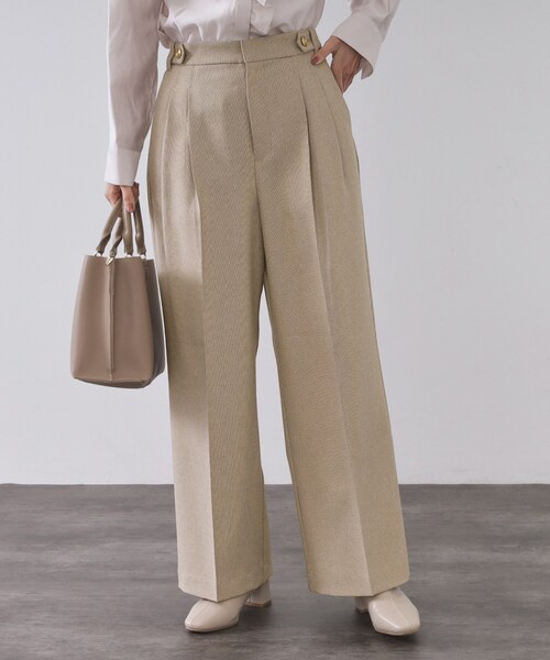 メランジ調の素材感とゴールドボタンをアクセントにしたタックワイドパンツ【セットアップ対応可能】 【デザイン】 ・ウエストタブとゴールドボタンをアクセントにした、タックワイドパンツ。 ・2タックデザインとセンタープレス入りのワイドシルエットで、スタイルUP可能なシルエットも魅力。 ・ウエストにデザインポイントがある為、ブラウスやニットなどトップスインですっきりとした着こなしがおすすめです。 ・同素材のジャケット(637-44020)と合わせて、セットアップスタイルでもお楽しみいただけます。 【素材】 ・メランジ感のあるポリエステル素材で、表情のある素材感です。 ・ストレッチ性もあり着心地も快適な素材。 ・マシンウォッシャブル、イージーアイロン機能付きでお手入れも簡単です。 【仕様】 ・脇ポケット×2、後ろ飾りポケット ・前ファスナー開き ・ウエスト後ろゴム ・裏地なし ※照明の関係により、実際よりも色味が違って見える場合があります。また、パソコン・スマートフォンなどの環境により、若干製品と画像のカラーが異なる場合もございます。 モデル情報:身長165cm B72 W57 H84 着用サイズ:38(M) 店舗へのお問い合わせ商品番号:637-64018 ●製品寸法: 36(S):W64~70cm H84cm 股下65cm 前股上33cm 渡り幅29cm 裾幅26cm 38(M):W67~73cm H88cm 股下66cm 前股上33cm 渡り幅30cm 裾幅26cm 40(L):W70~76cm H90cm 股下67cm 前股上34cm 渡り幅31cm 裾幅27cm 42(LL):W74~80cm H92cm 股下69cm 前股上35cm 渡り幅33cm 裾幅28cm 備考: