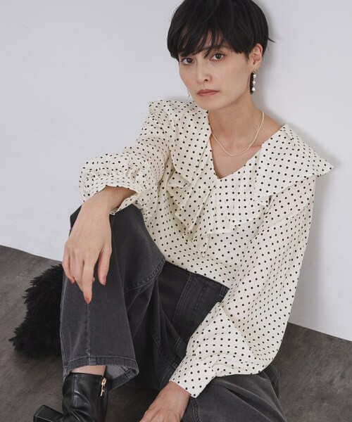 1枚着にもレイヤードにも最適なドット柄のラッフルブラウス【デザイン】・落ち感のある合繊素材を使用した、ドットプリントのラッフルブラウス。・Vネックでデコルテラインをすっきり見せながらも、襟周りのラッフルフリルで華やかな印象に。・インでもアウトで着ても決まる着丈と裾デザイン。・カーディガンやニットなどとレイヤードで着こなすのもおすすめです。・1枚でも華やかに決まるラッフルブラウスです。※後ろボタン開き仕様【素材】・落ち感のあるポリエステルジョーゼット素材を使用。・ランダムなオリジナルドットプリント。・シワになりにくいイージーアイロン素材。・マシンウォッシャブルでご自宅でのお洗濯も可能。------------------【C(シー) OPAQUE.CLIP】「PLAYFUL FEMININE」をキーワードに、天然素材と美しくポジティブなカラー、ワクワクするようなディティールや、ミックス感のあるスタイルなどファッションの楽しさを詰め込んだ新レーベルです※照明の関係により、実際よりも色味が違って見える場合があります。また、パソコン・スマートフォンなどの環境により、若干製品と画像のカラーが異なる場合もございます。モデル情報:身長165cm B77 W57 H85 着用サイズ:38(M)店舗へのお問い合わせ商品番号:637-84023●製品寸法:36(S):着丈61cm B94cm 袖丈60cm 肩幅36cm38(M):着丈62cm B96cm 袖丈61cm 肩幅38cm40(L):着丈63cm B98cm 袖丈62cm 肩幅40cm備考: