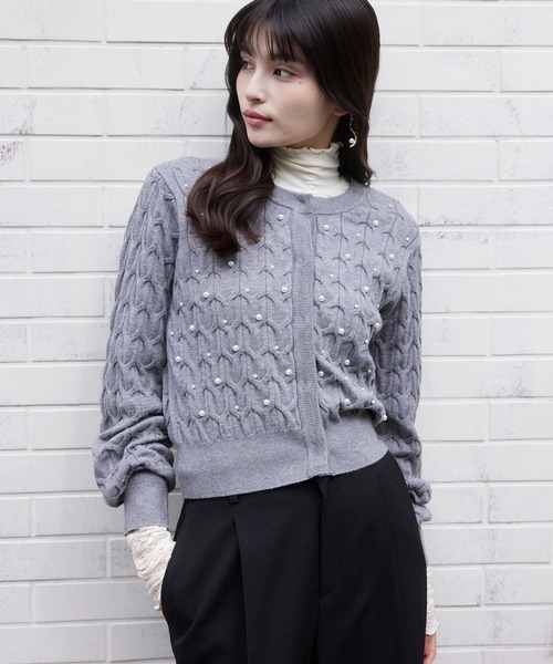 モチモチの着心地。華やかさも兼ね備えたパール付きカーディガン。◆2025秋冬◆<POINT>・見頃にパールがついた華やかなデザイン。・ケーブル柄編み。・モチモチの素材。・ハイゲージなのでアウターのインナーとしてもおすすめ。【デザイン・シルエット】大きめのケーブル柄にパールをランダムに付けたデザインカーディガン。パールがあるのでデザインを邪魔しないクルミスナップボタンにしています。コンパクトな丈感で羽織だけではなくプルオーバーのように着ていただくこともできます。袖口や裾はリブ仕様にし、きゅっと止まるデザインです。【素材】肌あたりが柔らかいモチモチ素材。テンションもあるので着心地がいいです。手洗い可能。【カラー】ブラック、チャコール、サックスの3色展開。【おすすめのスタイリング】カーディガンとしてはもちろん、前を全部止めてプルオーバーのように着るのもおすすめ。コンパクトなシルエットなのでパンツ、スカートどちらも合わせやすいです。-----------------------------裏地:なし光沢感:なし透け感:なし伸縮性:ややありポケット:なしボタン:スナップボタンあり(開閉可)生地の厚さ:普通その他仕様:正面のみパールがあしらっている季節:春、秋、冬-----------------------------【モデル着用サイズ】詳細モデル身長:161cm 着用サイズ:Fグレー、サックス着用モデル身長:164cm 着用サイズ:F※画像の商品はサンプルです。実際の商品と仕様、加工、サイズが若干異なる場合がございます。※画像によっては実際の色味と異なる場合があります。正しい色味は生地アップ画像をご確認ください。