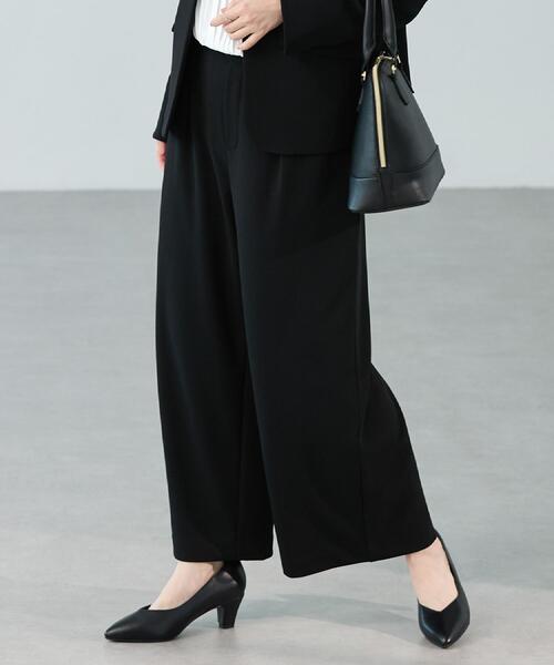 「きちんと」&「楽ちん」 が叶う、動けるセットアップシリーズ。 【デザイン】 伸縮性に富み、楽な穿き心地のきれいめワイドストレートパンツ。 素材特性を活かし、適度なゆとりがありながらも、脚がまっすぐきれいに見えるシルエットにこだわりました。 足首まわりが華奢に見えるように計算された裾幅もポイントです。 ウエストの後ろ部分はゴム仕様になっており、前はファスナーなしのプルオンタイプなので、締め付け感か少なくサッと穿いていただけます。 昨年モデルよりも裾幅を狭く、丈を長くし、デイリーシーンにさらに着まわしやすいアイテムへアップデートしました。 【スタイリング】 シンプルなデザインなので、デイリーからセレモニーシーンまで幅広く使っていただけます。 お仕事や食事会などきちんとしたシーンなら同素材のジャケットやジレを合わせたコーディネートがおすすめ。 カジュアルなお仕事着ならブラウスやダブルブレストのジャケットを合わせるとトレンドアップ。 スウェットやカットソーなどと合わせたカジュアルスタイルにもマッチします。 また、パンプスはもちろん、スニーカーやブーツなど色々なシューズとも合わせやすくなっています。 【素材】 上品なシボ感とさらりとした肌触り、ドレープが魅力。 ストレッチ性のあるジャージ素材。 布帛見えでフォーマル感もありつつ、ジャージならでは膨らみ・軽さでカジュアルスタイルにも相性よい素材感です。 セレモニーからデイリーシーンまで幅広く使っていただけます。 シワも目立ちにくく、長時間の着用でも外観変化が少ないため、上品できれいな佇まいが続きます。 【仕様】 ・ポケット数:横×2 ・ウエスト後ろゴム ・裏地なし ※同素材で ジャケット(C62‐45300)、テーパードパンツ(C62‐65300)、ジレ(C62‐25300、C62‐25301)をお作りしています。 ※照明の関係により、実際よりも色味が違って見える場合があります。また、パソコン・スマートフォンなどの環境により、若干製品と画像のカラーが異なる場合もございます。 #通勤#セレモニー#ママスーツ#入 モデル情報:身長166cm B80 W59 H85 着用サイズ:02(M) 店舗へのお問い合わせ商品番号:C62-65301 ●製品寸法: 01(S):W66~85cm H103cm 股下62cm 前股上29cm 渡り幅34cm 裾幅29cm 02(M):W69~89cm H106cm 股下63cm 前股上30cm 渡り幅36cm 裾幅30cm 03(L):W72~91cm H109cm 股下64cm 前股上30cm 渡り幅37cm 裾幅31cm 04(LL):W75~94cm H112cm 股下65cm 前股上31cm 渡り幅38cm 裾幅32cm 05(3L):W79~98cm H116cm 股下65cm 前股上31cm 渡り幅39cm 裾幅32cm 備考: