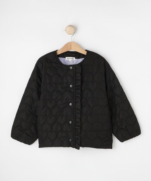 【デザイン】ハート型のキルトが可愛いライトアウターです。前立て部分にはフリルをデザインし、上品なノーカラー仕様が幅広いコーデに合わせやすい1枚です。秋から冬の変わり目や、朝晩の冷え込みが気になるシーズンに活躍してくれる軽めのアウターはアクティブなキッズのマストアイテム。姉妹リンクコーデにもおすすめです。【素材】さらっとした風合いのハート型キルト素材を使用しています。【仕様】・ポケット数:横×2・裏地あり※照明の関係により、実際よりも色味が違って見える場合があります。また、パソコン・スマートフォンなどの環境により、若干製品と画像のカラーが異なる場合もございます。店舗へのお問い合わせ商品番号:122-44002●製品寸法:10(100cm):着丈41cm B78cm 袖丈30cm 肩幅36cm11(110cm):着丈45cm B82cm 袖丈34cm 肩幅39cm12(120cm):着丈48cm B86cm 袖丈38cm 肩幅41cm13(130cm):着丈51cm B90cm 袖丈42cm 肩幅43cm14(140cm):着丈54cm B94cm 袖丈45cm 肩幅45cm15(150cm):着丈56cm B98cm 袖丈48cm 肩幅47cm備考:重量:110(110cm)約205g